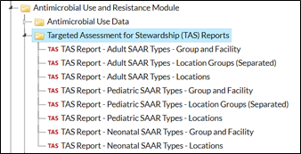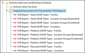 To find the TAS reports, navigate to the Analysis Reports page by clicking Analysis, then Reports on the left-hand navigation bar. You’ll notice the TAS Reports have their own subfolder within the Antimicrobial Use and Resistance Module folder.