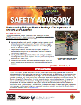 This safety advisory provides recommendations for fire departments to ensure firefighters are trained to safely use and interpret data from multi-gas monitors to determine if a hazardous atmosphere is present when responding to natural gas and propane incidents.