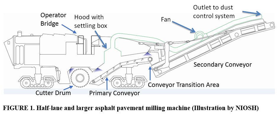 A milling machine or cold-planer is a type of highway construction machinery equipped with a toothed rotary cutter drum and conveyor system capable of rapid removal of recycled asphalt pavement. The dust control fitted to each machine is an engineering control solution that includes a combination water spray and ventilation system attached to the machine that reduces silica dust before it can reach the worker as shown in Figure 1. In this study NIOSH evaluated the effectiveness of the dust controls for all milling machine manufacturers that sold milling machines to the US market:![]() A NIOSH document, Best Practice Engineering Control Guidelines to Control Worker Exposure to Respirable Crystalline Silica during Asphalt Pavement Milling, provides detailed recommendations for ventilation controls and water-sprays on asphalt milling machines that includes detailed engineering drawings [NIOSH 2015]. Additional information on effective dust control designs is also provided in a peer-reviewed journal article [Hammond et al. 2016]. The ventilation control recommendations provided in the NIOSH document focus on providing an enclosure around the drum housing and conveyors, proper hood and duct design, airflow capacity, durability of the duct and fan, and measures to prevent clogging of the ventilation control. To contain silica dust, the manufacturers designed their systems to remove air and maintain negative air pressure in the drum housing of the milling machine to provide containment near the source of dust generation. Milling machine manufacturers also optimized water-sprays along the primary and secondary conveyor in addition to the original water applications applied only to the drum to cool cutting teeth. The results of the study indicate that the evaluated ventilation dust controls in combination with water-sprays are capable of controlling occupational exposures to respirable crystalline silica during a wide range of typical highway construction jobs using asphalt pavement milling machines. |