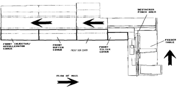 Researchers from the National Institute for Occupational Safety and Health (NIOSH) were requested to assist the USPS in the evaluation of particulate controls for various mail processing equipment. These new controls are being installed to reduce operator exposure to any potentially hazardous contaminants emitted from letter mail during normal mail processing. This effort is driven by the terrorist attacks which used the mail as a delivery system for anthrax. NIOSH researchers conducted evaluations of an exhaust ventilation system developed for the Automated Flat Sorting Machine (AFSM) 100 (Figure 1). This system was installed by the machine’s manufacturer to reduce the potential employee exposure to harmful substances that could be contained in mail processed by the machine. ![]() Three automated feeders supply flat mail pieces. Once in the transport system, the image of each individual piece is captured. An optical character reader (OCR) reads any barcodes and the content of the address. The mail pieces are then injected into one of 759 pockets that circulate around the machine. If the correct Z1P code is determined, the mail piece is released into one of the 120 sort bins. If the address on the mail piece cannot be read by the OCR, the image of that piece is sent to a Video Coding Room in the facility. The AFSM 100 consists of a number of modules, the modules significant to the control of a potential contaminant in the mail include the feeder module, the Tilter module, the OCR module, and the interface 950 module It is in these parts of the system that the mail pieces undergo the most violent actions as they are loaded onto the machine and fed through the machine by rollers that pinch the mail. Also, at the feeder module, the mail pieces are near the worker and have the potential to release a contaminant into the worker's breathing zone. The evaluated control was retrofitted for the AFSM by the manufacturer. The control is designed to reduce emission of bacterial contaminants such as spores of B. anthracis into the ambient atmosphere through use of particle collection capabilities and filtration units. By taking advantage of the enclosed Tilter, OCR and Interface 950 Modules on the AFSM, the interior of the machine was ventilated by adding exhaust to the machine cabinet. Inside the cabinet, air intakes were placed along the path taken by the mail pieces to collect any contaminant potentially in the mail. These intakes focused on the areas around pinch points as these have the highest potential for releasing a substance. The feed table of the AFSM was also controlled by intakes located perpendicular to the feed belt and above the mail pieces. |