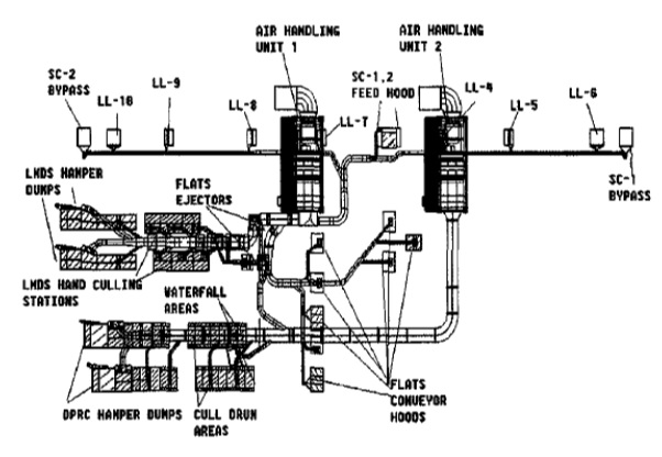 | Evaluations were based on a variety of tests including tracer gas experiments, air velocity measurements and smoke release observations. The ventilation system met or exceeded overall expectations for the tracer gas experiments (above 98% capture efficiency) and for smoke release observations (excellent capture at all points). These results can be explained by the large air volume that is moved into the VFS in this area. At the DPRC system some smoke did escape when released against the flow on the conveyor belt. However, when sampled with test mail, the smoke was pulled into the VFS with no noticeable complications. The air velocity measurements were consistently above 150 fpm (goal for UPSP capture velocity) at all points, even when tested with a 25% flow reduction of regular flow characteristics. |