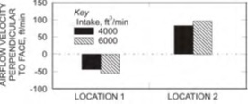 Air velocities were measured concurrently at two locations at the face—the curtain side (location 1) and the off-curtain side (location 2) (Figure 1). To simplify the comparisons, the component of the velocity moving perpendicular to the face was calculated for each test. By convention, an airflow moving away from the face was given a negative velocity. Figure 2 shows velocities measured with no sprays operating.