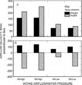 • Airflow direction, toward and away from the face, varied o With straight sprays, airflow moved toward the face. o With angled sprays, airflow moved away from the face. • Increasing the water pressure increased velocity.