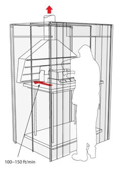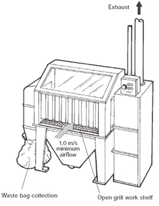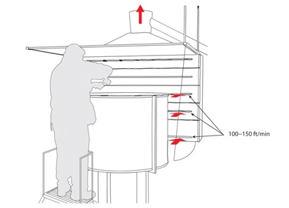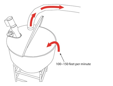 Ventilated back-draft workstations used for small batch mixing have been evaluated in two field studies conducted in flavoring production plants (Figure 1). These stations were designed to maintain an air velocity of 100–150 feet per minute (fpm) at the face of the enclosure. The field studies showed reductions in exposure of 90%–97% when performing mixing tasks using these stations. The key design parameters are to enclose as much of the activity as possible and to use properly sized exhaust slots to maintain a uniform air velocity across the face of the station. Research into the effectiveness of bag dump stations (Figure 2) has shown that they can effectively reduce worker exposure to dust and vapors. A review of commercially available units showed that their use controlled dust levels to between 1–2 mg/m3. However, dust contamination on the surface of the bag and handling/disposal of bags caused increased worker exposure. An integral pass through to a bag disposal chute/compactor will help reduce dust exposure resulting from bag handling. Further studies in mineral processing plants showed that the use of an overhead air supply also significantly decreased worker exposure. The use of controls to reduce worker exposure during pouring and mixing of ingredients in a commercial mixer has been evaluated in a flavoring production plant. NIOSH evaluated the impact of a ventilated tank lid on the exposure of a worker during the mixing of a food flavoring (Figure 5). The use of the ventilated tank lid resulted in a reduction of approximately 76% compared to the same operation without the ventilated tank lid. Most of the exposure during the evaluated mixing process was attributed to tasks performed outside of the hood. Another approach evaluated by NIOSH at a flavoring manufacturing facility was the use of a ventilated mixing booth. This booth allows a large portable mixing tank to be rolled inside so that chemical vapors emitted during pouring and mixing of flavoring ingredients in the tank are captured and exhausted outdoors (Figure 6). However, the booth provides some flexibility and can also be used for other production tasks such as large pouring and product packaging activities. The use of slots across the booth plenum helps evenly distribute the flow across the height and width of the booth. A field study showed hood capture efficiencies of greater than 95% based on tracer gas tests. An important design consideration is to make the booth deep enough to fully contain the process. |