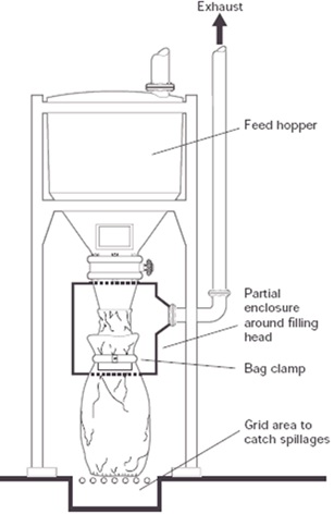 The food and flavoring production industries have several primary processes that may result in increased potential for worker exposure to diacetyl, 2,3-pentanedione, and other flavoring chemicals. These processes may be grouped, from an exposure standpoint, into a few general categories including production operations, packaging operations, cleaning, and maintenance operations. Workers in each of these job categories may potentially be exposed to flavoring chemicals, including diacetyl and 2,3-pentanedione. The following paragraphs discuss some of these common operations as well as an applicable control for reducing worker exposure. Small Scale Weighing of Materials Small-scale weighing and handling of ingredients are common tasks used in flavoring production, bakeries, dairy production, and snack food manufacturing. The tasks of weighing out both dry and wet food ingredients can lead to worker exposure primarily through the scooping, pouring, and dumping of these materials. Because weighing and pouring are often performed on a benchtop workstation, the addition of slotted backdraft ventilation for both the bench and the weighing area is recommended (Figure 1). ![]() Bag Dumping/Emptying The opening and dumping of bags of powdered ingredients is commonly performed by workers in the production of flavorings, dairy products, snack foods, and in bakeries. Typically, a worker cuts open bags of material (e.g., 50-lb bags) and dumps the ingredients into a hopper, and then stacks or disposes of the empty bags. In powdered flavoring production, these hoppers are commonly outfitted onto blenders used to load the base starch ingredient for dry flavor blends. In snack food production, they may be used to load spices and flavors for application to the product via open drum coaters just before packaging. Technology used to control dusts during bag dumping has been in place for many years. The standard control—a ventilated bag dump station—consists of a hopper outfitted with an exhaust ventilation system to pull dusts away from workers as they open and dump bags of powdery materials (Figure 2). The designs for these devices are examples available from several sources of industrial ventilation guidance. ![]() Bag Filling The process of filling bags with product is typically done by flavor manufacturers and other producers of powder materials. Powder flavorings are typically mixed with industrial blenders or produced by a spray drying process. For the blending process, a powdered starch or other carbohydrate is combined with a liquid or paste flavoring agent. When the blending is completed, the powder product may be discharged into a bulk tote or packaged into smaller containers. In the spray-drying process, a mixture of liquid and powder ingredients (slurry) is sprayed within a large sealed tank. Heat within the tank dries the slurry droplets, leaving a powder as the finished product. This powder is then collected and packaged in product containers. Studies conducted at flavoring production facilities have shown that intermittent peak exposures to dust and flavoring volatile ingredients occur when powder products are being packaged following blending or spray drying. The use of a ventilated collar-type hood around the discharge point can help minimize worker exposure to dust and vapors. The control includes the specification of a ventilated enclosure around the powder discharge outlet and has applicability to the filling of smaller product bags as well as intermediate bulk containers (Figure 3). ![]() In addition to ventilation solutions, other dust control approaches have been used in a variety of industries and should be applicable for food and flavoring production. For example, an inflatable seal can be used to create a dust tight seal on the discharge outlet of an industrial blender (Figure 4). The outlet spout can be fitted with an inflatable seal that prevents dust from escaping during the bag filling process. Another system that can be used is the continuous liner system. Polypropylene liners are often used when products are discharged from the industrial blenders into the final product container. In this operation, a sleeve of polypropylene liners is stowed around the circumference of the discharge outlet. The first liner, the bottom having been sealed, is pulled down into the overpack (usually a 5-gallon bucket or a cardboard box). Product is discharged into the liner through a butterfly valve on the blender outlet. Once full, the top of the first liner sleeve is closed using tape or a fastener, or it is heat sealed and cut. The product is sealed within the poly-lined container, and a new sealed poly liner is pulled down to start discharge into the next container. This continuous process seals off the primary leak paths for dust during unloading of an industrial blender or other equipment. ![]() Charging/filling tanks and mixers The addition of solid and liquid ingredients into tanks and other mixing vessels can cause exposure to dusts and vapors due to the displacement of air in the vessel. The use of controls to reduce worker exposure during pouring and mixing of ingredients in a commercial mixer has been evaluated in a flavoring production plant. The use of LEV at the mixing tank helps to maintain the vessel at a negative pressure and contain evaporative emissions. NIOSH evaluated the impact of a ventilated tank lid on the exposure of a worker during the mixing of a food flavoring (Figure 5). The use of the ventilated tank lid resulted in a reduction of approximately 76% compared to the same operation without the ventilated tank lid. Most of the exposure during the evaluated mixing process was attributed to tasks performed outside of the hood. Another approach evaluated by NIOSH at a flavoring manufacturing facility was the use of a ventilated mixing booth. This booth allows a large portable mixing tank to be rolled inside so that chemical vapors emitted during pouring and mixing of fla