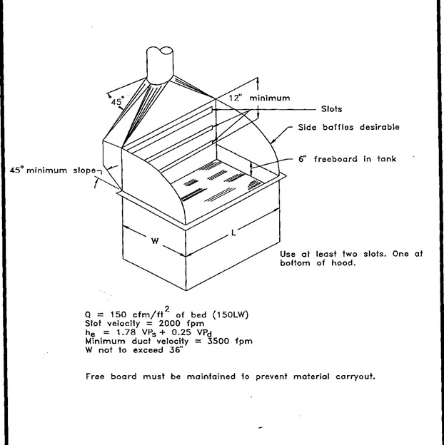 The industrial hygiene evaluations considered the following areas: Pink Boll Worm Rearing • Packaging • Egg Stacking and Tray Washing • Egg Preparation • Pupae Stripping • Emergence Mexican Fruit Fly Rearing Facility • Pupae Dyeing • Radiation • Screening • Diet Preparation Gypsy Moth Rearing Group • Quarantine • Quality Control • Egg Counting • Diet preparation • Tray Washing Specific control recommendations were made for each area evaluated. These controls were based on reducing potential worker exposure to dusts that may contain insect parts. The recommendations generally specified ventilation controls that could be used to reduce dusts (e.g. local exhaust hoods). Illustrations of hoods similar to those provided in American Conference of Governmental Industrial Hygienists (ACGIH) industrial ventilation guidelines were included. Figure 1 is an example of an illustration included in the recommendations for packaging in the cold room for pink boll worm rearing. As appropriate, the use of HEPA filtered vacuum cleaners was also recommended. ![]() |