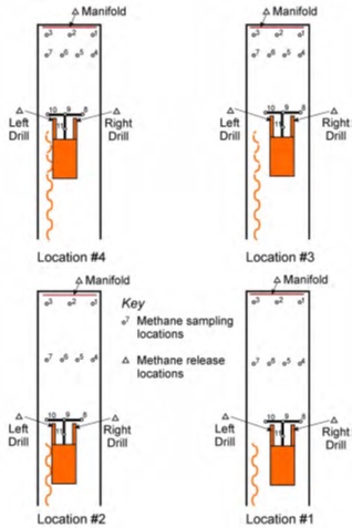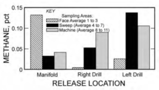 • Highest at the face when gas was released from the manifold. • Highest at the sweep location when the gas was released from the right or left drill locations.
