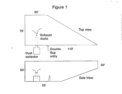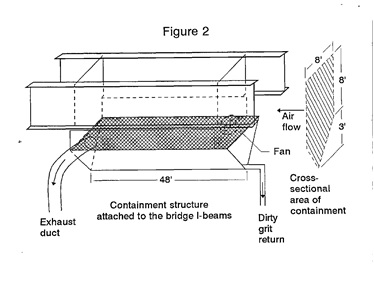 The first control system consisted of abrasive blasting with low silica (<1% by weight) sand, Star Blast XL (EI DuPont DeNemours and Company, Inc., Wilmington, DE) in a large enclosure made of interconnected canvas tarps suspended from the top of the roadway down to the ground, creating a room with a volume of 200,000 cubic feet. Within the left half of the containment the overpass was 50 feet above the ground. From the middle of the containment the ground sloped up to the right so that the far side of the overpass was 20 feet above the ground (Figure 1). The enclosure was ventilated by two 20-inch diameter exhaust ducts which were suspended from a light pole; this placed the duct openings approximately 12 feet above the ground. There were unplanned openings (most were at ground level where the tarps were not adequately fastened to the ground tarps) that acted as supply air inlets. Figure 1 shows a top and side view of the large containment and accompanying exhaust system. The Star Blast abrasive was used one time and allowed settle to the floor tarps along with other wastes created by the paint removal process, then it was collected for disposal. ![]() The second system of abrasive blasting with recyclable steel grit in a 3,000 ft3 enclosure (8’X8’X48’) made of an alloy piping for the frame, rigid corrugated polycarbonate panels for the sides and an aluminum grating floor. The enclosure was suspended from two I-beams under the bridge (Figure 2). The small enclosure had a supply air fan at one end and an exhaust duct with a fan at the other end. The sloping walls under grate flooring directed the used abrasive and wastes to the bottom center of the containment area where the materials were removed from the containment. The steel grit was air washed using a recycle machine (IPEC Advanced Systems, North Kingston, RI) and reused. In both the large and small containment, the workers donned a single-use dust respirator under a continuous-flow, loose-fitting hood respirator prior to entering the containment and did not remove the respirator inside the containment. ![]() NOTE: The control information in this engineering control write-up is taken directly from the following publication: Mickelsen LR, Froehlich PA [1994]. Control technology for removing lead-based paint from steel structures: abrasive blasting inside two ventilated containment systems. Cincinnati, OH: U.S. Department of Health and Human Services, Public Health Service, Centers for Disease Control and Prevention, National Institute for Occupational Safety and Health, DHHS (NIOSH), ECTB 183-14a. |