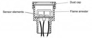 The sensor head must be covered with a dust cap to protect the sensor element or sensor chamber from dust or water [30 CFR 27.22]. Within the cap, a flame arrestor made of screen or porous material is used to prevent any ignition of methane gas from moving outside the sensor head.