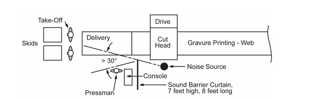The goal is to lower this level to a safe range where a worker can be safely exposed an entire work shift. Figure 1 shows the operator location, control station, cutting head, and carton delivery. To reduce the noise of the cutter head at the operator position, a barrier wall was used. As access to the unit for job changes and maintenance was important, the barrier wall was specified to be lead-loaded vinyl sound stopper curtain material, available on a made-to-order basis and designed to be portable.