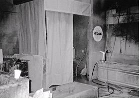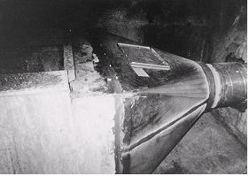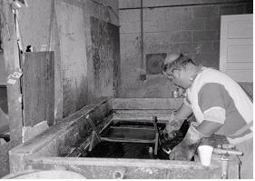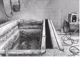 Local exhaust ventilation can be used to control exposures to methylene chloride during furniture stripping processes. Local exhaust ventilation systems capture contaminated air from the source before it spreads into the workers’ breathing zone. If engineering controls are not effective, only a self-contained breathing apparatus equipped with a full facepiece and operated in a positive-pressure mode or a supplied-air respirator affords the necessary level of protection. A local exhaust system consists of the following: a hood, a fan, ductwork, and a replacement air system. Two processes are commonly used in furniture stripping: flow-over and dip tanks. For flow-over systems there are two common local exhaust controls for methylene chloride – a slot hood and a downdraft hood. A slot hood of different design is most often used for dip tanks. The hood is made of sheet metal and connected to the tank. All designs require a centrifugal fan to exhaust the fumes, ductwork to connect the hood and the fan, and a replacement air system to bring conditioned air into the building to replace the air exhausted. NIOSH researchers from the Engineering Control Technology Branch (ECTB) recommended, constructed, and installed the newly designed local exhaust ventilation system at a furniture stripping and refinishing facility in Cincinnati, OH. The ventilation system was constructed of galvanized sheet metal with reinforcement steel used on stress points in order to maintain the system’s physical integrity. A plenum was attached to the front end of the tank and to the slot hoods on each side of the tank in order to obtain even airflow distribution throughout the system. A 12” diameter duct ran from the center of the front plenum, through the wall of the building, into a fan located outside. For this evaluation, a portable, gasoline powered fan rated at 4100 cfm in free air was used. |