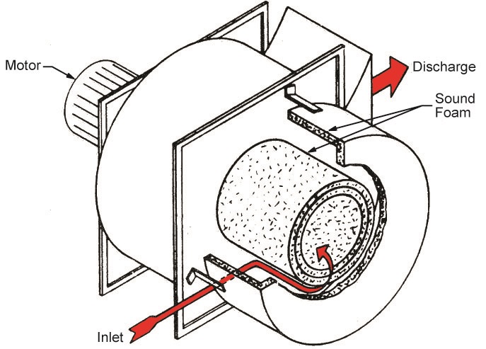 The major noise reduction was accomplished by (1) using a smaller main blower impeller since, for a given speed, smaller impellers are quieter than larger ones, (2) removing the scrubber blower and using a static air cleaning device, and (3) installing a specially designed muffler at the main blower inlet. Figure 2 shows the essential features of the treatments.
