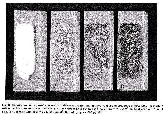 To detect levels of mercury vapor in herbarium cabinets, a microscope slide is coated with a thin layer of mercury indicator powder mixed with deionized water. The mercury indicator is composed of a mixture of cuprous iodide, sulfur, amorphous silica, and starch in proprietary proportions. The dry, yellow powder becomes reddish-brown on exposure to mercury vapor, and becomes gray in color when wetted and then exposed to the vapor. This technique can be used to screen empty cabinets to determine if they have become contaminated by mercury vapor over time and to test incoming shipments of specimines to determine whether they are likely to cause cross-contamination if housed with specimens that were never treated with mercury salts. The sensitivity of the indicator was shown to be greater than that of the Jerome 431-X Mercury Vapor Analyzer and comparable to that of the Lumex RA-915+ Analyzer, suggesting that the indicator is an especially useful tool when screening for very low concentrations of mercury vapor in closed environments.