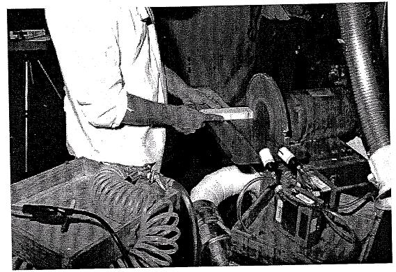 | The friction between the wheel of the disc sander/ belt of the belt sander and the ceramic workpiece results in the release of particles and fibers. Those particles are ejected at high speeds along a path tangential to the rotation of the wheel. The respirable particles, if not captured, can be carried into the breathing zone of the worker resulting in exposure to the refractory ceramic fibers and dust particles. | |