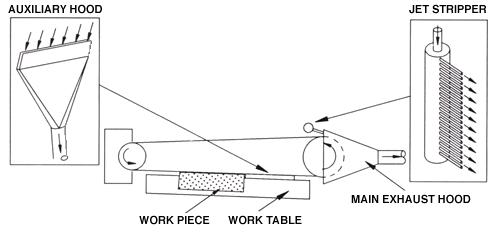 Surveys by NIOSH researchers indicated that wood dust from the horizontal belt sanders used in woodworking was not effectively controlled. As a result, researchers developed an inexpensive auxiliary ventilation system for the horizontal belt sanders that significantly reduced wood dust emissions into the workroom. Typically, belt sander emissions are controlled only by an exhaust hood covering the drive pulley. The new system consists of two devices: a narrow Auxiliary Hood and an Air Jet Stripper. The Auxiliary Hood is located between the belt surface and the worktable downstream from the sanding operation. The Air Jet Stripper is located inside the main exhaust hood. These two devices, in combination with the main exhaust hood, decrease wood dust in the workroom without affecting the sanding operations. In addition, the Jet Stripper cleans the belt, reducing the frequency of belt changes.