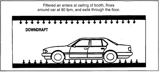 Particulate overspray concentrations in the NIOSH study were 15 times lower when using a downdraft booth than with crossdraft or semi-downdraft booths. HVLP guns are believed to have a transfer efficiency of at least 65%, while conventional spray-painting guns are commonly reported to have a transfer efficiency of 20 to 40%. |