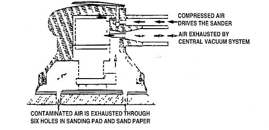 Ventilated Sanders Rotary/orbital and straight line/reciprocating sanders, equipped with high-velocity, low-volume (HVLV) local exhaust ventilation as part of the tool’s design, are recommended because they have been shown to be effective in reducing total dust concentrations during the sanding of body filling compounds. HVLV sanders have either a straight-line or a rotary/orbital sanding motion. For orbital/rotary sanders, the sanding pad has a diameter of 10 to 20 cm. It usually between 6 and 12, 1-cm diameter holes located 1 to 3 cm from the outer edge. The sanding pad of a straight-line sander is usually 7 to 8 cm wide and 40 to 50 cm long. Along the length of the sanding pad are two rows of nine equally spaced 1-cm diameter holes. These holes are 1 cm from the edge of the sanding pad. Air is exhausted from ventilated sanders between 0.25 and 1.0 m3/min. Use of ventilated sanders can be enhanced by making them convenient to use, for example, by installing retractable, flexible hosing attached to a central vacuum system. Although initial costs for this system including an air mover (e.g. vacuum), air cleaners, and duct work can be substantial, the system will help eliminate expensive repaints, shorten clean up time, and extend sandpaper life. Workers prefer using these HVLV sanders and also reported their use results in a cleaner shop. |