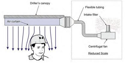 Canopy air curtain. In addition to dust created by the roof bolter itself, bolter operators can also be exposed to miner-created dust when bolting is required downwind of the continuous miner. NIOSH developed and tested a device to deliver fresh air over the operator’s breathing area that would reduce dust exposure while working downwind of the continuous miner [Goodman and Organiscak 2002]. A fan located at the rear of the bolter draws in entry air, filters the air, and supplies it to the area beneath the canopy through tubing and a plenum (Figure 3). The plenum is the same shape as the canopy and covers the same area so that protection is provided while the operator is under any portion of the canopy. Laboratory tests have shown that this concept reduced dust levels under the canopy by nearly 60%.