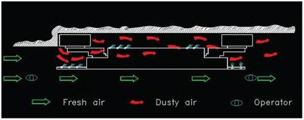 Face ventilation. In coal mining, ventilation is the primary means to dilute liberated methane to safe levels. It is also the principal method of controlling respirable dust on the longwall face. Providing adequate amounts of air to dilute and carry airborne dust down the face and prevent it from migrating into the walkway has been and continues to be a goal for longwall operators. Previous studies [Mundell et al. 1979] have reported that face air velocities of 400–450 feet per minute (fpm) seem to be the minimum appropriate to control respirable dust. A German study [Breuer 1972] reported that the optimum velocity range may be increased to 700–900 feet per minute (fpm) when the moisture content of the dust particles is 5%–8%. An MSHA study [Tomb et al. 1992] reported that as face air quantities increased, even beyond 1,200 fpm, respirable dust levels along the face decreased. As air velocities increase, it is important to ensure that sufficient wetting of the coal is provided to minimize the potential of increased entrainment with the higher air velocities. The higher velocities provide greater air quantities for better dilution of intake dust, as well as dust generated during shield support movement. Higher velocities over the shearer help confine the dust to the face area and lower the potential for contaminating the walkway. Also, the higher velocities will improve the diffusion of dust from stagnant areas in the headgate and along the support line. In recent NIOSH surveys [Rider and Colinet 2007], the average velocity was 665 fpm, and two longwalls had velocities over 800 fpm. The average quantity of air along the face was 67,000 cubic feet per minute (cfm), an increase of about 65% compared to the mid-1990s longwall study [Colinet et al. 1997].