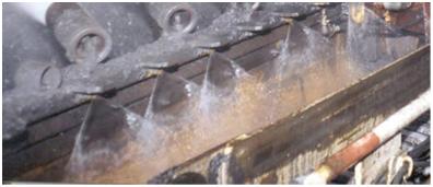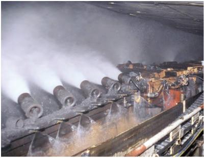 Lump breaker spray manifold. Positioning a spray manifold at the end of the lump breaker and directing the spray down toward the conveyor can provide better, more uniform wetting of the cut coal. Using larger-orifice sprays operated at pressures less than 80 psi will provide higher volumes of water per spray wetting without creating turbulence.