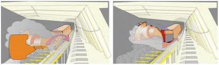 Directional water spray systems. Water sprays can be very efficient air movers and, if applied properly, can be used to augment the primary airflow and reduce the amount of shearer-generated dust that migrates into the walkway near the shearer. Water sprays mounted on the shearer body act very much like small fans, moving air and entraining dust in the direction of their orientation [Jankowski and Colinet 2000]. Poorly designed shearer-mounted spray systems with nozzles directed upwind at the cutting drums actually force dust away from the face, where it mixes with clean intake air and is carried out into the walkway over the shearer operators. A directional spray system called the shearer-clearer [Jayaraman et al. 1985] takes advantage of the air-moving capabilities of water sprays and confines the dust-laden air against the face. It consists of several shearer-mounted sprays oriented downwind to augment the primary ventilation airflow. Also, it includes one or more passive barriers that split the airflow around the shearer into clean and contaminated air (Figure 1). The air split is initiated by a splitter arm that extends from the walkway side of the shearer body parallel to the headgate ranging arm. Conveyor belting hangs down from the splitter arm to the pan line to provide a physical barrier between the face conveyor and the walkway. In addition, a series of water sprays is mounted on top of the splitter arm to induce airflow and dust movement toward the coal face.