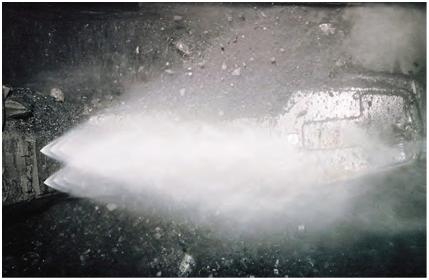Drum-mounted water sprays. Drum-mounted water sprays apply water for dust suppression directly at the point of coal fracture and add moisture to the product to minimize dust liberation during coal transport. Although very effective at minimizing dust generation at the point of coal fracture, shearer drum water sprays can actually increase airborne respirable dust levels if operated at water pressures that are too high. Instead of suppressing dust generation, these sprays can force the dust out away from the cutting drum, allowing it to mix with the primary airflow, where it is then carried throughout the entire cross-sectional area of the longwall face [Jankowski and Colinet 2000]. Previous studies [Shirey et al. 1985] have shown that shearer drum water sprays are very effective at minimizing dust generated, but increasing shearer drum water spray pressure above 100 psi can increase the shearer operator’s dust exposure by as much as 25%. For most operations, the optimum operating drum spray pressure seems to be 80–100 pounds per square inch (psi). Full-cone sprays are the most effective type of spray pattern to use in shearer drums. These sprays increase wetting without inducing substantial air movement around the drum. Reducing nozzle pressures while increasing water quantity can be accomplished by installing spray nozzles with larger orifices that provide greater flow at reduced operating pressures.