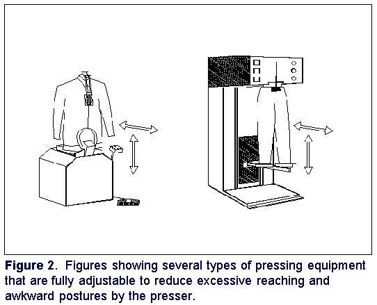 | Ergonomic risk factors increase the threat of injury to the musculoskeletal system of the worker. Musculoskeletal disorders are caused by repetitive motions, awkward postures, excessive reaching, and precision gripping. In the dry cleaning industry, ergonomic risks occur during garment transfer, pressing, and bagging. These activities, combined with a high work rate and frequency, may cause physical discomfort and musculoskeletal problems for workers. | |