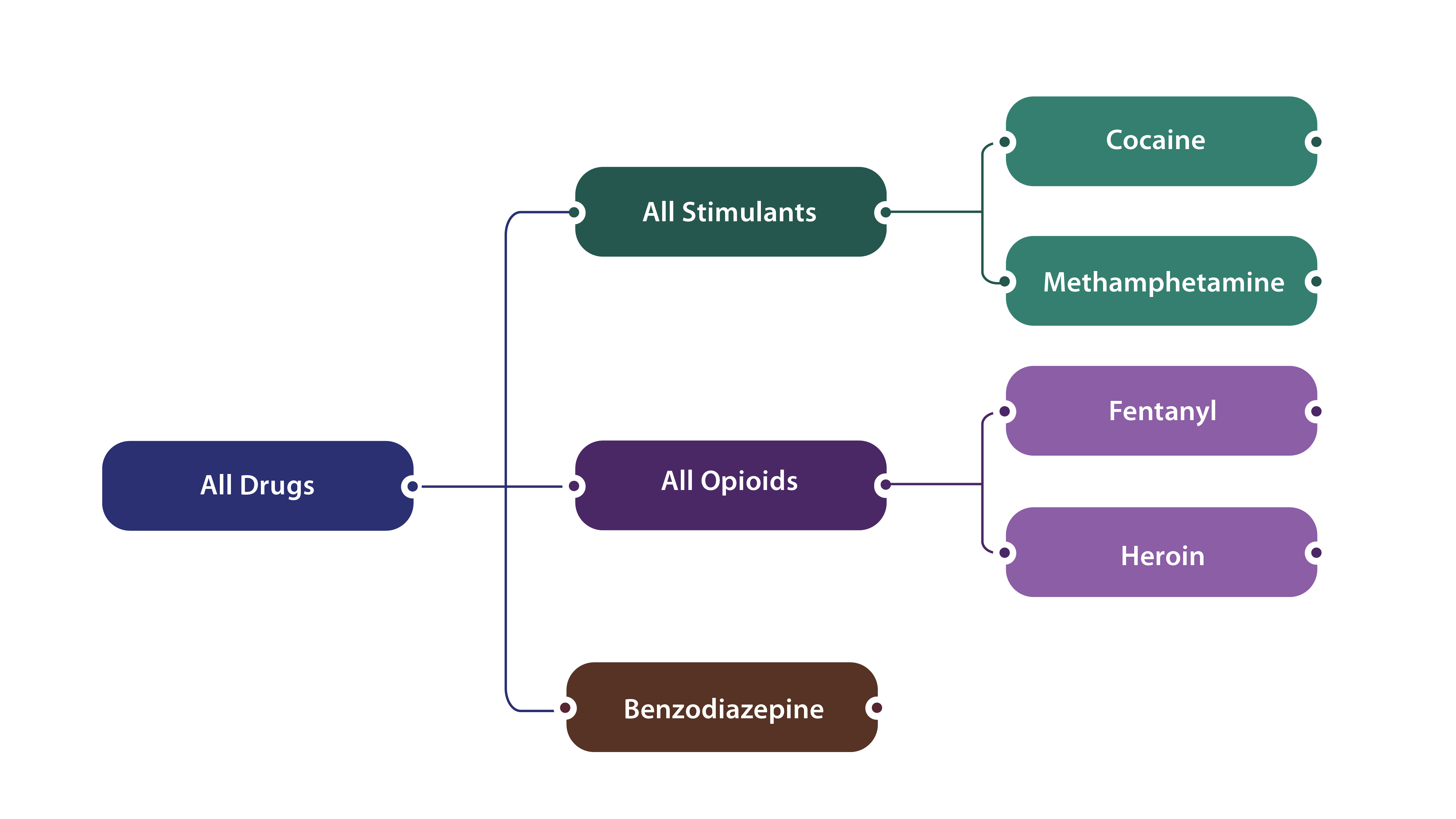 In both DOSE-SYS and DOSE-DIS, the surveillance definitions are not mutually exclusive but rather reflect nesting of drug categories (depicted in the figure below). Some overdose visits may involve multiple substances (e.g., a given overdose-related emergency department visit or inpatient hospitalization could have involved both opioids and stimulants).