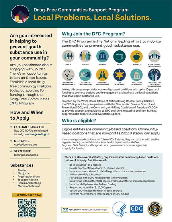 Fact Sheet: Contains information on the Drug-Free Communities (DFC) program, how to join, who is eligible, and when to apply. The DFC Program is the nation's leading effort to mobilize communities to prevent youth substance use.