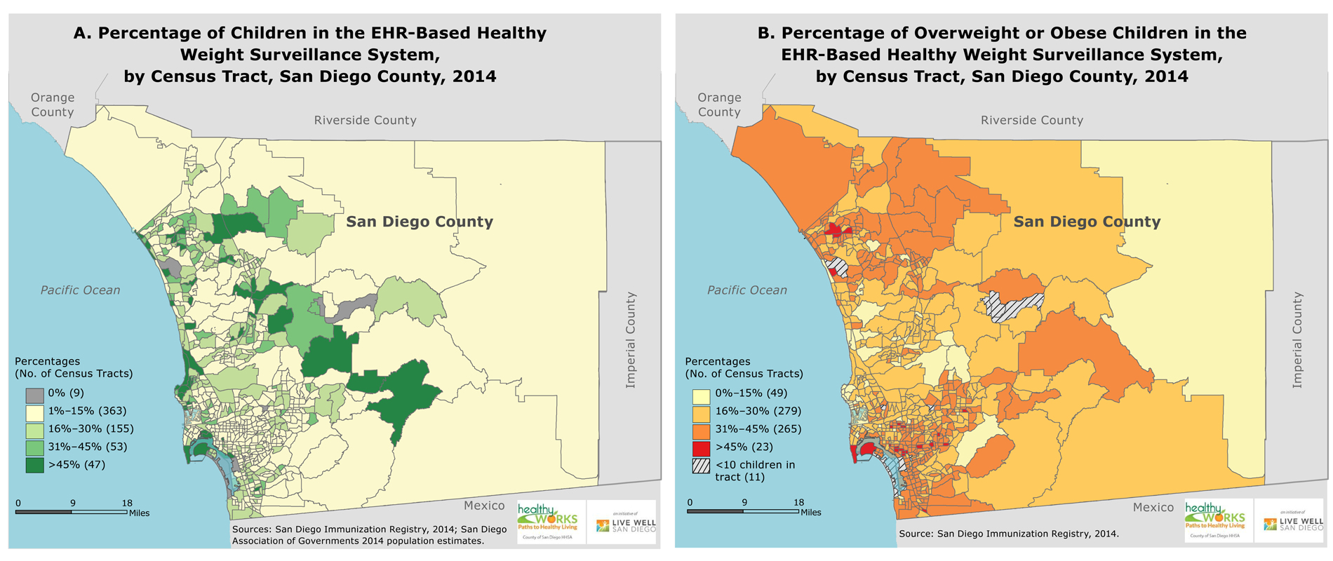 Figure. The San Diego EHR-Based Healthy Weight Surveillance System includes, on average, 18.5% (standard deviation, 19.4%) of children per census tract. These preliminary, nonrepresentative data illustrate geographic variation in the prevalence of overweight and obese children. The maps demonstrate both the strengths and the challenges of using EHR-based data for surveillance. Abbreviation: EHR, electronic health record. [A text description of this map is also available.]
