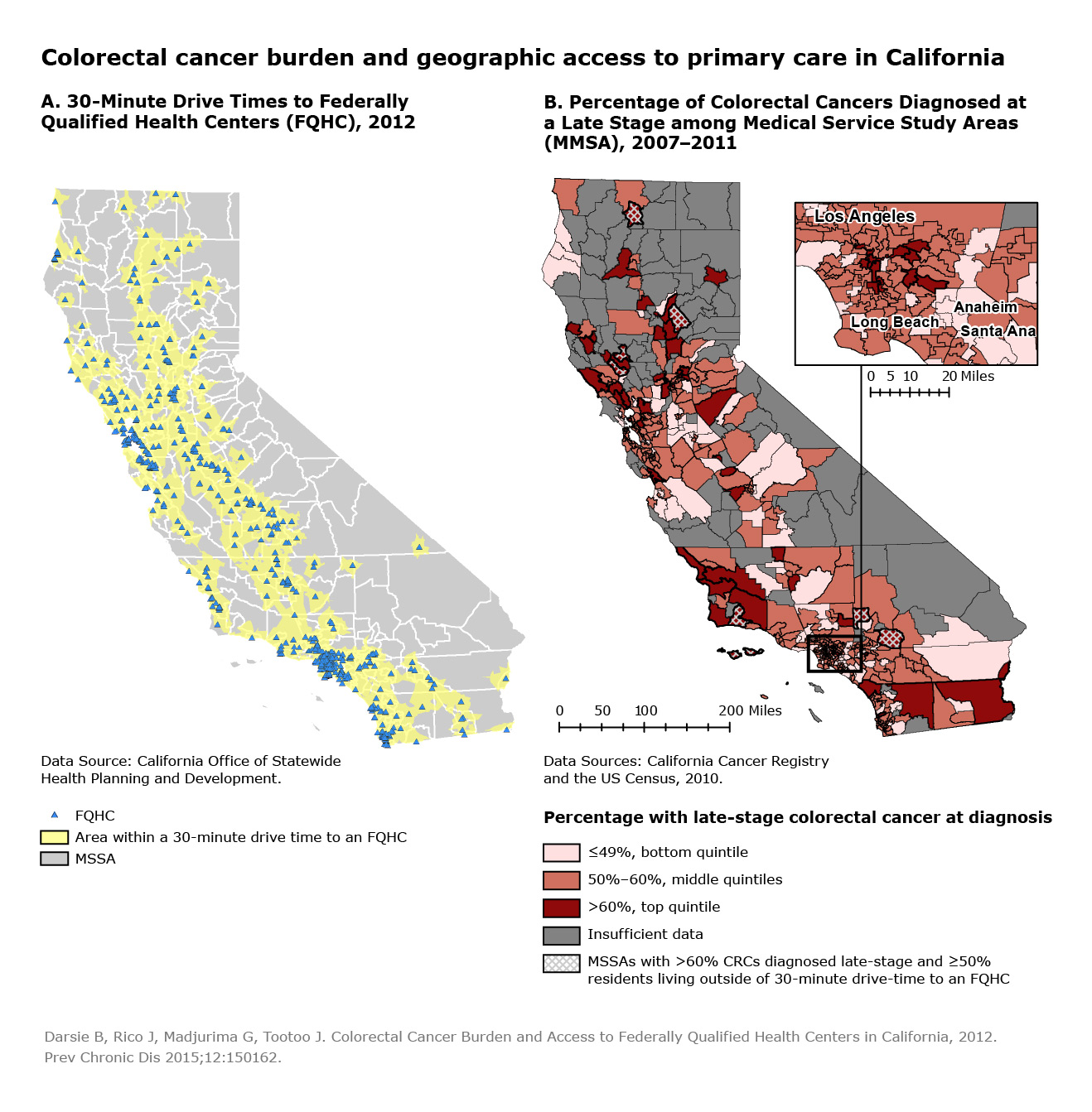 Suggested citation for this article: Darsie B, Rico J, Gadgil M, Tootoo J. Colorectal Cancer Burden and Access to Federally Qualified Health Centers in California. Prev Chronic Dis 2015;12:150162. DOI: http://dx.doi.org/10.5888/pcd12.150162.