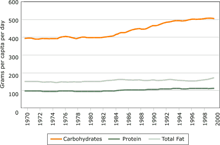 Figure 9. U.S. food supply of macronutrients in grams per capita per day, 1970–2000. Data from Food Consumption Data System, Economic Research Service, U.S. Department of Agriculture (7). [A text description of this chart is also available.]