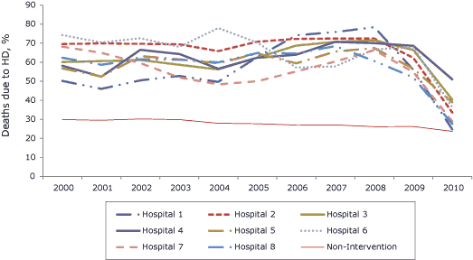 Figure 1. Percentage of deaths attributed to heart disease at each of the 8 intervention hospitals and at all nonintervention hospitals combined, New York City, 2000–2010. [A tabular version of this figure is also available.]