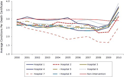 Figure 2. Average number of conditions reported per death at each of the 8 intervention hospitals and at all nonintervention hospitals combined, New York City, 2000–2010. [A tabular version of this figure is also available.]