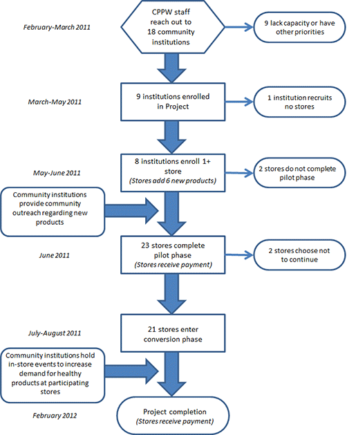 Nine community institutions participated. Of the 53 corner stores approached, 25 (47%) participated in the trial phase, which included offering 6 healthful foods in their stores. Of those, 21 (84%) completed the conversion phase, which included expansion of healthful foods through additional equipment and marketing and promotional activities.