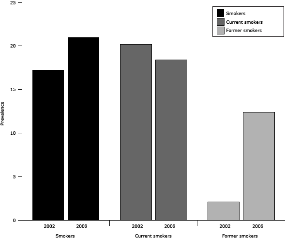 Comparison of tobacco use between provincial results (2002) and municipal results (2009). Prevalence of smoking rose by 3.7 percentage points from 2002 to 2009, while current smoking decreased by 1.8 percentage points. However, the prevalence of former smoking also increased sharply by 10.3 percentage points (Figure 2).