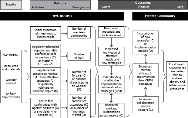 Figure. New York City Communities Putting Prevention to Work mentoring grant evaluation logic model, displaying the DOHMH planning process and results related to the 2 program model types used in the institutional mentoring program, the collaborative model, and the one-to-one model, 2010–2012. Abbreviation: NYC DOHMH, New York City Department of Health and Mental Hygiene; TA, technical assistance; C, collaborative model; O, one-to-one model. [A text description of this figure is also available.]