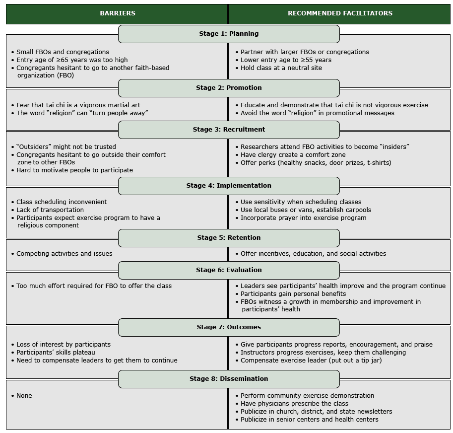 Figure. Key barriers and facilitators by intervention stage from stakeholders who attended project forums before adoption of the Ti Ji Quan: Moving for Better Balance program in rural faith-based organizations, West Virginia, 2013–2014 [A text version of this figure is also available .