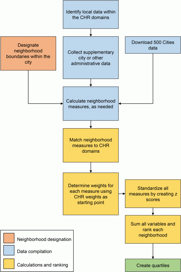 Cities aiming to use our methodology should note 2 key considerations. First, the terms “community” and “neighborhood” are difficult to define and operationalize, despite theoretical work in sociology, anthropology, geography, social work, urban studies, and health research (22). As such, drawing lines between neighborhoods is often highly debated. We used and recommend the following steps for creating neighborhoods 1) scan city and local data sets for existing neighborhood boundaries (eg, planning districts, survey boundaries, neighborhood geographies, real estate boundaries), 2) designate boundaries that align with census tracts to facilitate harmonization of geographic boundaries from different data sources, 3) incorporate local knowledge from government or local agencies to finalize neighborhood designations, and 4) ensure that neighborhoods are of sufficient sample size. For aligning neighborhoods with health data, boundaries used by health agencies could be considered, where possible. Nonetheless, neighborhood boundaries may still mismatch resident perspectives and may not be stable over time if social, cultural, economic, or physical features shift. Second, available health measures for individual cities may differ from the measures used by CHR and our NHR. Cities replicating our method may need to make similar substitutions to those we made. As mentioned, these substitutions do not need to be exact, if they align to the original intent of the category.