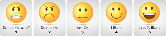 To gauge consumer acceptance of lower-sodium products (ie, foods that fell at or below the sodium guidelines as defined for our study), we conducted unmatched Likert taste test surveys on both original and modified products among congregate meal clients. The taste test surveys used emoticons to gauge food satisfaction (Figure). Foods were rated and coded for analysis on a Likert scale as 1, really do not like; 2, do not like; 3, neither like nor dislike; 4, like; and 5, really like. An SRCP evaluator, in consultation with a food service company chef and the CICOA registered dietitian nutritionist, set a predetermined level of 75% (Likert score of 3.75) as a goal for consumer acceptability on taste tests. We conducted taste tests for both dishes in the first year of our study. We first tested the original 2 potato dishes and then the modified potato dishes the second time those were served to clients. The desired sample size for taste tests was calculated from the total number of clients at congregate meal sites (N = 70) by using a 95% CI. Four congregate meal sites were chosen as taste test locations to assure a variety of settings, maximize the number of participants, and be feasible given staffing limitations. One to 3 MCPHD employees conducted taste tests at each congregate meal site. In addition to scoring satisfaction, we collected participant gender to compare results. The staff member(s) also sorted taste test scores by participant gender for comparison (Table 2).