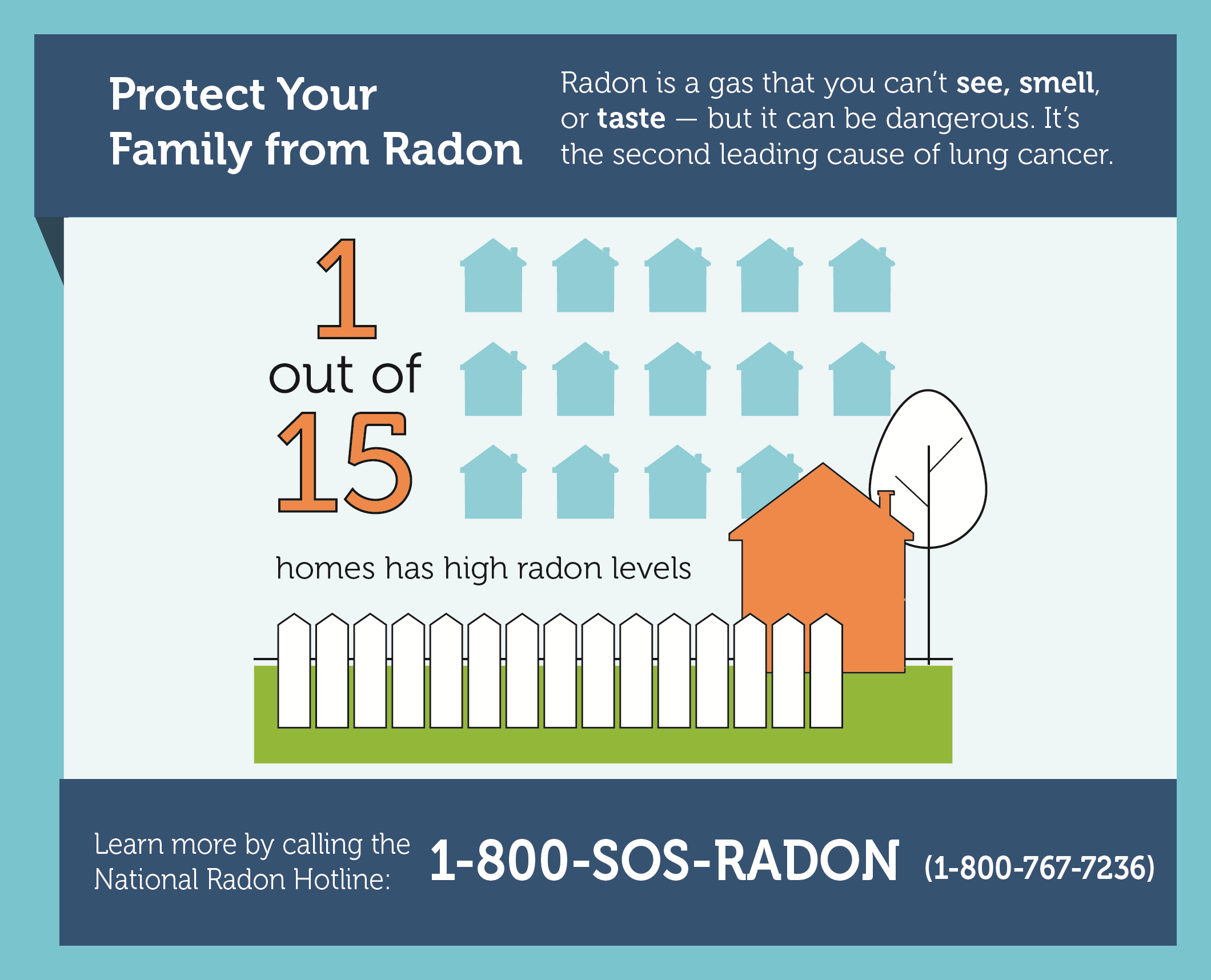Suggested alt text: Protect Your Family from Radon. Radon is a gas that you can't see, smell, or taste – but it can be dangerous. It's the second leading cause of lung cancer. 1 out of 15 homes have high radon levels. Learn more by calling the National Radon Hotline: 1-800-SOS-RADON. (1-800-767-7236).