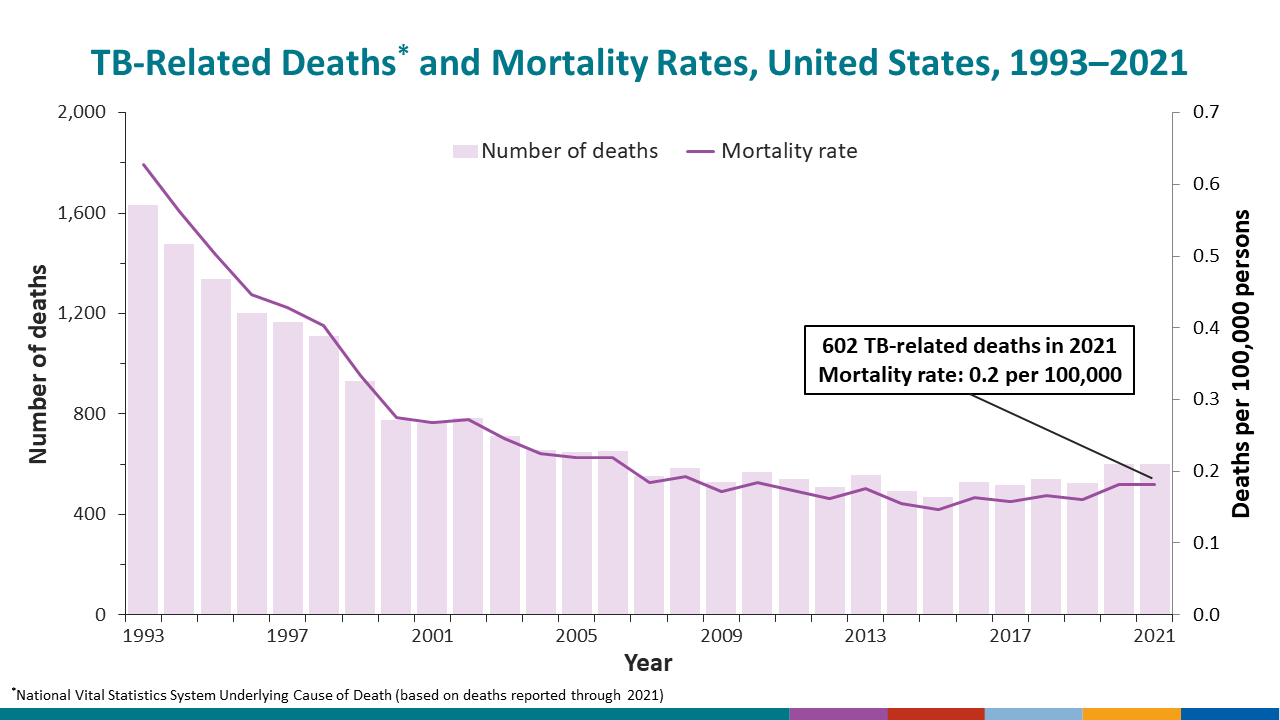 There were 602 TB-related deaths (0.2 deaths per 100,000 persons) reported in 2021, the most recent year for which data are available.