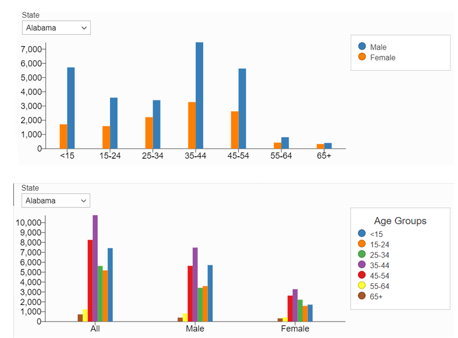 Note that both bar charts require a filter on the State column. Otherwise, the tool could not determine which combination of age group and gender data to display.