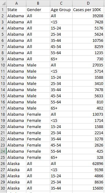 - The data in this example are organized in columns by U.S. state, gender, age group, and cases per 100K, but the same data could be structured in other ways. For example, the gender values or age group values could have their own columns (see example of an alternative structure). We’re featuring this ultra-vertical structure because it’s very flexible, as you will see. But content owners may have good reasons for providing similar data in different structures.