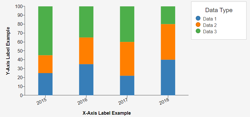 For the example dataset, stacked bars for gender (i.e., where each bar segment represents male or female data) would be an option, but ideally, each bar in a stacked chart should be the same height (or width for horizontal charts). This means that the best use of the stacked bar is to represent percentage data in which the total for each bar is 100 or any data in which the total value for all bars is the same. The image on the right shows a bar chart with the same denominator for all bars.