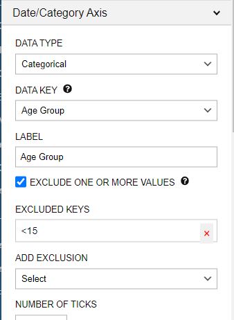 In addition to the value axis, the cartesian charts — bar, line, and combo — have a Date/Category Axis. The primary fields are the Data Type, Data Key, and Label. For most charts, the options for Data Type are Date or Category. The Data Key is the set of variables upon which the X axis is based. You can select multiple data series (in the Data Series panel), but you can select only one data key.