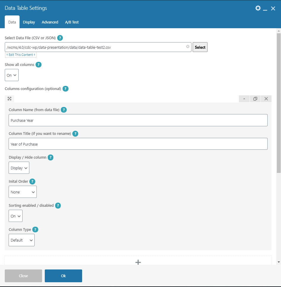 Based on the table settings, the WCMS auto-generates some, none, or all of the table columns. Auto-generated columns use the column title from the source file and are sortable. You can configure individual columns in order to change the column title, turn sorting on/off, etc.
