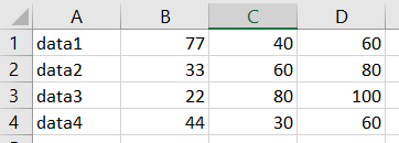 The picture above shows a spreadsheet for a pie chart with three segments. Note that the chart tool can aggregate multiple columns of data and render the chart segments based on the totals. For example, using the spreadsheet below, you could have the tool sum all three data columns. The pie segment for data1 would be based on [77 + 40 + 60]; segment data 2 would be based on [33 + 60 + 80], etc. The percentage for each segment would be based on the sum of all values in the three columns.