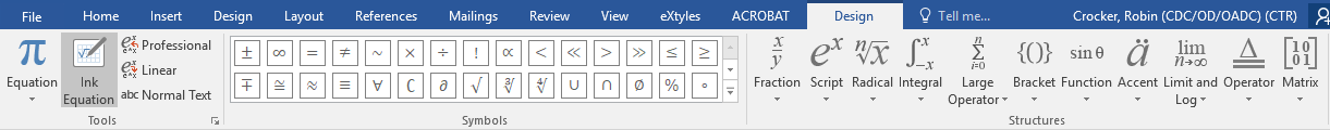 With the cursor in the equation container, you can also open the Design menu to access equation tools and options: